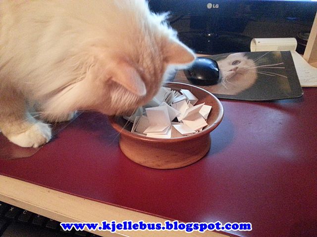 Sitter och väntar på lite assistans från min matte att veckla upp lappen , är ju lite svårt när man inte har några tummar :(